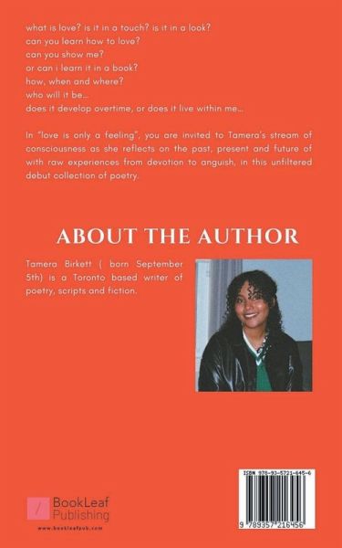 ""what is love? is it in a touch, is it in a look? can you learn how to love? can you show me? can I learn it from a book? how, when and where? who will it be? does it develop overtime, or does it live within me... In "love is only a feeling", you are invited into Tamera's neurotic stream of consciousness as she reflects on the past, present and future with raw experiences from devotion to anguish, in this unfiltered debut collection of poetry.""