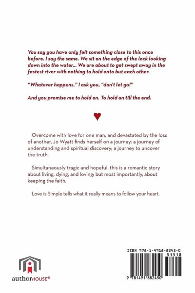 You say you have only felt something close to this once before. I say the same. We sit on the edge of the lock looking down into the water... We are about to get swept away in the fastest river with nothing to hold onto but each other. "Whatever happens," I ask you, "don't let go!" And you promise me to hold on. To hold on till the end. Overcome with love for one man, and devastated by the loss of another, Jo Wyatt finds herself on a journey: a journey of understanding and spiritual discovery; a journey to uncover the truth. Simultaneously tragic and hopeful, this is a romantic story about living, dying, and loving; but most importantly, about keeping the faith. Love is Simple tells what it really means to follow your heart.