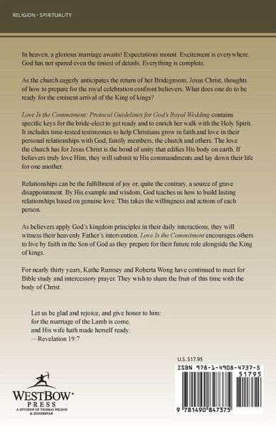In heaven, a glorious marriage awaits! Expectations mount. Excitement is everywhere. God has not spared even the tiniest of details. Everything is complete. As the church eagerly anticipates the return of her Bridegroom, Jesus Christ, thoughts of how to prepare for the royal celebration confront believers. What does one do to be ready for the eminent arrival of the King of kings? Love Is the Commitment: Protocol Guidelines for God¿s Royal Wedding contains specific keys for the bride-elect to get ready and to enrich her walk with the Holy Spirit. It includes time-tested testimonies to help Christians grow in faith and love in their personal relationships with God, family members, the church and others. The love the church has for Jesus Christ is the bond of unity that edifies His body on earth. If believers truly love Him, they will submit to His commandments and lay down their life for one another. Relationships can be the fulfillment of joy or, quite the contrary, a source of grave disappointment. By His example and wisdom, God teaches us how to build lasting relationships based on genuine love. This takes the willingness and actions of each person. As believers apply God¿s kingdom principles in their daily interactions, they will witness their heavenly Father¿s intervention. Love Is the Commitment encourages others to live by faith in the Son of God as they prepare for their future role alongside the King of kings. For nearly thirty years, Kathe Rumsey and Roberta Wong have continued to meet for Bible study and intercessory prayer. They wish to share the fruit of this time with the body of Christ. Let us be glad and rejoice, and give honor to him: for the marriage of the Lamb is come, and His wife hath made herself ready . --Revelation 19:7