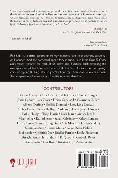 Red Light Lit's debut poetry anthology explores love, relationships, sexuality, and gender-and the corporeal spaces they inhabit. Love Is the Drug & Other Dark Poems features the work of 33 poets and 8 artists, with 10 black-and-white photographs and 2 illustrations.