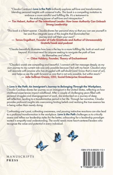 In Love Is the Path: An Immigrant's Journey to Belonging Through the Workplace, Claudia Cardozo shares her journey as an immigrant in the United States, reflecting on how childhood experiences impact adulthood. After a couple of challenging years filled with personal struggles and disengagement at work, she embarked on a journey of deep self-reflection, leading to a transformative period in her life. Through her narrative, Claudia provides profound insights into overcoming limiting beliefs and realizing the true essence lies in being rather than merely doing. Confronting one's past, cultivating awareness, and pausing instinctive reactions can also lead to a profound transformation in the workplace. Love Is the Path challenges us to critically assess and refine our leadership styles for the better, advocating for a leadership paradigm rooted in empathy and understanding. The world needs more heart-centered leaders who recognize the value and potential in every individual. "Claudia Cardozo's Love is the Path brilliantly explores self-love and transformation, blending personal insights with universal truths. This book is a compelling invitation to embrace a more mindful and fulfilling life. It's a testament to the enduring power of self-love and introspection." - Tim Hebert, Author of The Intentional Leader: How Inner Authority Can Unleash Strong Leadership "This book is a heart-opener. Claudia shares her personal story so that you can see yourself in her and thus integrate some of the insights that illuminated her journey and call them your own!" - Terces Engelhart, Founder of Cafe Gratitude and Author of Unreasonably Grateful book and podcast "Claudia beautifully illustrates how love is the key to a more fulfilling life, both at work and beyond. It's a must-read for anyone seeking to navigate the path of love for themselves and others." - Chloe Valdary, Founder, Theory of Enchantment "Claudia's words are compelling and beautiful. I connect with her message deeply, as my own journey to my current role was only possible because I led with my heart. Claudia's story will resonate with anyone who has struggled with self-doubt (and I know that is most of us!), and helps us see the path forward as one that is not only possible, but within reach." - Julie Sullivan Owens, CEO, Social Enterprise Greenhouse