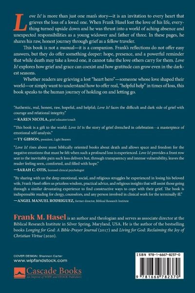 Loss is something everyone experiences in different ways. Love Is! is the moving story of one man's journey of grief, grace, and gratitude following the loss of the person he loved the most, his wife. Frank Hasel shares the unvarnished, painful complexities of dealing with the realities of bereavement and beyond as he grapples to come to terms with the new, unwanted realities of being a young widower and single parent to three boys. It tells of the transformative grace that helps him express gratitude in the most difficult of circumstances. Love doesn't die when the person you love dies. Love endures, but how do you express that love in meaningful and constructive ways? This is not a self-help manual, but rather an invitation to share one man's journey and insights. If you have ever wondered how to help someone struggling with the emotional turmoil created by a significant loss, this book will provide practical insights into what is ""helpful help."" This is a story for everyone who has ever lost a heart hero, someone they loved dearly . . . and lost themselves in the process! You are not alone!