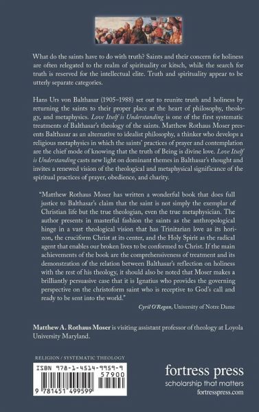 Hans Urs von Balthasar (19051988) sets out to reunite Truth and holiness by returning the saints to their proper place at the heart of philosophy, theology, and metaphysics. Love Itself is Understanding is one of the first systematic treatments of Balthasars theology of the saints. Matthew Rothaus Moser presents Balthasar as an alternative to Idealist philosophy, a thinker who develops a religious metaphysics in which the saints practices of prayer and contemplation are the chief mode of knowing that the Truth of Being is divine love. Love Itself is Understanding casts new light on dominant themes in Balthasars thought and invites a renewed vision of the theological and metaphysical significance of the spiritual practices of prayer, obedience, and charity.