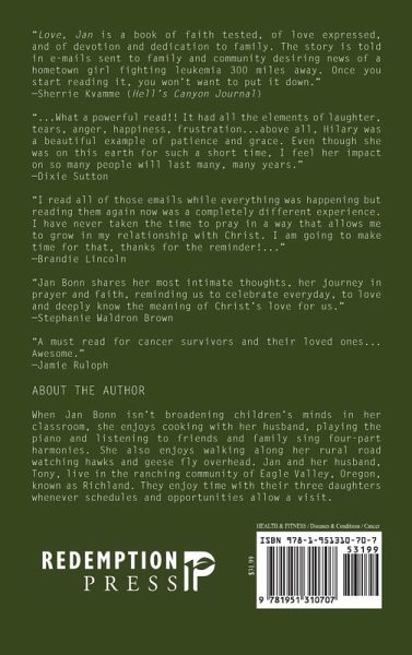 Eighteen-year-old Hilary Bonn was just starting out in life, preparing for college and adventures beyond her small-town beginnings, when leukemia interrupted all of her plans. To help her body fight the ugly disease, Hilary required a stem cell transplant. While she endured PICC lines, pills, and endless precautions against germs, her family encouraged her and one another with Christmas lights, thoughtful words, warm hugs, soft music, action movies, entertaining books, and their abundant love. During this time, Jan Bonn kept family and friends updated of her daughter's treatment and progress through frequent e-mail messages. Love, Jan is a compilation of these messages. Jan's accounts of medical consultations and procedures, the uncertainties of life-changing decisions, and times of expectant waiting are infused with humor, insight, and hope told from the heart of a loving mother and faithful child of God. Love, Jan, Hilary's story of faith, hope, and joy, will inspire and encourage stem cell transplant patients and those who love them.