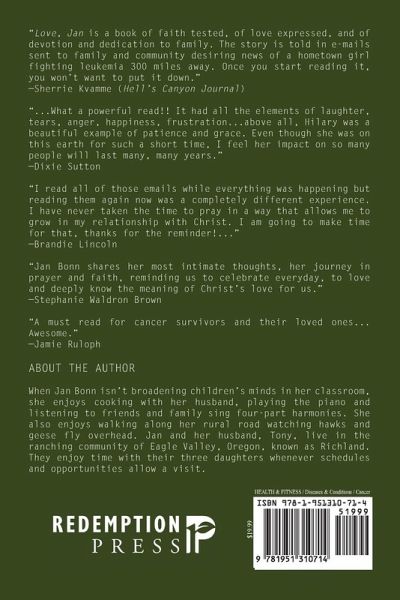 Eighteen-year-old Hilary Bonn was just starting out in life, preparing for college and adventures beyond her small-town beginnings, when leukemia interrupted all of her plans. To help her body fight the ugly disease, Hilary required a stem cell transplant. While she endured PICC lines, pills, and endless precautions against germs, her family encouraged her and one another with Christmas lights, thoughtful words, warm hugs, soft music, action movies, entertaining books, and their abundant love. During this time, Jan Bonn kept family and friends updated of her daughter's treatment and progress through frequent e-mail messages. Love, Jan is a compilation of these messages. Jan's accounts of medical consultations and procedures, the uncertainties of life-changing decisions, and times of expectant waiting are infused with humor, insight, and hope told from the heart of a loving mother and faithful child of God. Love, Jan, Hilary's story of faith, hope, and joy, will inspire and encourage stem cell transplant patients and those who love them.