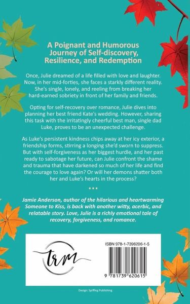 A Poignant and Humorous Journey of Self-discovery, Resilience, and Redemption Once, Julie dreamed of a life filled with love and laughter. Now, in her mid-forties, she faces a starkly different reality. She's single, lonely, and reeling from breaking her hard-earned sobriety in front of her family and friends. Opting for self-recovery over romance, Julie dives into planning her best friend Kate's wedding. However, sharing this task with the irritatingly cheerful best man, single dad Luke, proves to be an unexpected challenge. As Luke's persistent kindness chips away at her icy exterior, a friendship forms, stirring a longing she'd sworn to suppress. But with self-forgiveness as her biggest hurdle, and her past ready to sabotage her future, can Julie confront the shame and trauma that have darkened so much of her life and find the courage to love again? Or will her demons shatter both her and Luke's hearts in the process? Jamie Anderson, author of the hilarious and heartwarming Someone to Kiss, is back with another witty, acerbic, and relatable story. Love, Julie is a richly emotional tale of recovery, forgiveness, and romance that readers have praised for "nailing the humor and snarky nature of our generation."
