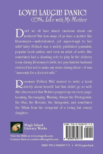 Don't we all have mixed emotions about our mothers? But how many of us have a mother like Rosemary's-multi-talented, yet super-tough to live with? Luby Pollack was a widely published journalist, popular book author, and even an artist of sorts. She sometimes had a daunting role to play. In the delivery room during Rosemary's birth, her psychiatrist husband ordered her not to make any noise during labor-it was "unseemly for a doctor's wife." Rosemary Pollack Mild started to write a book strictly about herself, but that didn't go so well. She discovered that Mother popped up on every page. Looming. Encouraging. Warning. Always the Protagonist, the Star, the Heroine, the Antagonist, and sometimes the Villain from the viewpoint of a loving but ornery daughter.