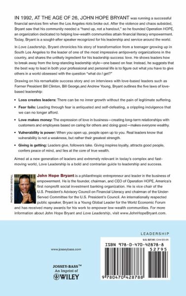 Written by the founder of Operation HOPE and advisor to the past two U.S. presidents, this groundbreaking book makes the case that the best way to get ahead is to figure out what you have to give to a world seemingly obsessed with the question: What do I get? Aimed at a new generation of leaders and extremely relevant for today's economic climate, Love Leadership outlines Bryant's five laws of love-based leadership-Loss Creates Leaders (there can be no strength without legitimate suffering), Fear Fails (only respect and love leads to success), Love Makes Money (love is at the core of true wealth), Vulnerability is Power (when you open up to people they open up to you), and Giving is Getting (the more you offer to others, the more they will give back to you).