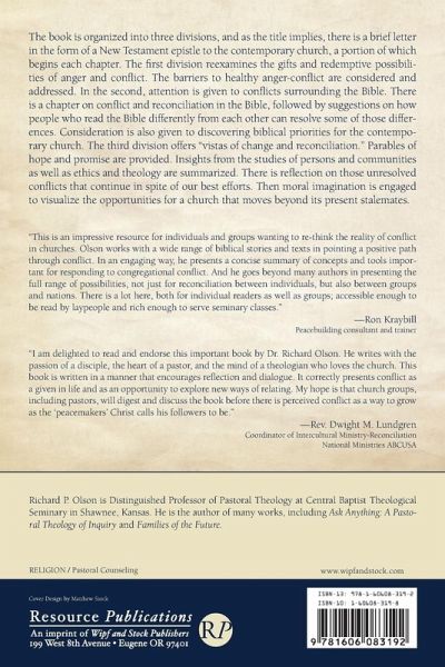 The book is organized into three divisions, and as the title implies, there is a brief letter in the form of a New Testament epistle to the contemporary church, a portion of which begins each chapter. The first division reexamines the gifts and redemptive possibilities of anger and conflict. The barriers to healthy anger-conflict are considered and addressed. In the second, attention is given to conflicts surrounding the Bible. There is a chapter on conflict and reconciliation in the Bible, followed by suggestions on how people who read the Bible differently from each other can resolve some of those differences. Consideration is also given to discovering biblical priorities for the contemporary church. The third division offers "vistas of change and reconciliation." Parables of hope and promise are provided. Insights from the studies of persons and communities as well as ethics and theology are summarized. There is reflection on those unresolved conflicts that continue in spite of our best efforts. Then moral imagination is engaged to visualize the opportunities for a church that moves beyond its present stalemates.