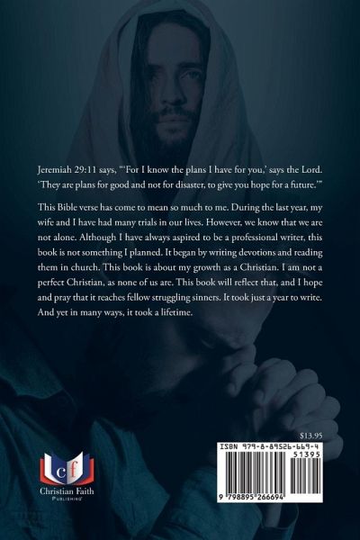 Jeremiah 29:11 says, "'For I know the plans I have for you,' says the Lord. 'They are plans for good and not for disaster, to give you hope for a future.'" This Bible verse has come to mean so much to me. During the last year, my wife and I have had many trials in our lives. However, we know that we are not alone. Although I have always aspired to be a professional writer, this book is not something I planned. It began by writing devotions and reading them in church. This book is about my growth as a Christian. I am not a perfect Christian, as none of us are. This book will reflect that, and I hope and pray that it reaches fellow struggling sinners. It took just a year to write. And yet in many ways, it took a lifetime.