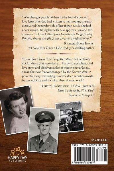 For more than seventy years, a tattered box tied with lace ribbon, yellowed with age, had been tucked away, untouched and unknown to anyone but the long-deceased recipient and owner of that box ~ my mother. As I carefully opened the box, I discovered not just a precious few, but over 70 letters lovingly tucked away, carefully preserved, as if waiting patiently for me to find them and liberate the inner most feelings of a young soldier going off to fight in the Korean War, ultimately ending up on the front lines at Heartbreak Ridge. More than its historic value and firsthand documentation of events that are today taught in history books, these letters were, to me, of greater personal value-documenting my parents' courtship and giving me the much needed insight into the heart and mind of a man I never really knew - my father. Hunting down an aged family photo album that I remembered seeing as a child, I found the pictures that had been contained with the letters and corroborated the geographical landscape and passage of time the letters traversed. I was able to put the actual photographs with the letters and envelopes they'd been entrusted with. The story does not end with my father's final letter. I hope you will be as profoundly affected by the letters as I was, all the way to the final chapter-a journey which took me decades and a lifetime to fully understand.