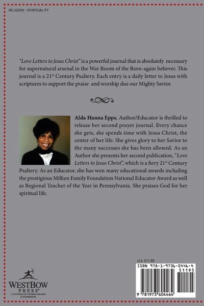 "Love Letters to Jesus Christ" is a powerful journal that is absolutely necessary for supernatural arsenal in the War Room of the Born-again believer. This journal is a 21st Century Psaltery. Each entry is a daily letter to Jesus with scriptures to support the praise and worship due our Mighty Savior.
