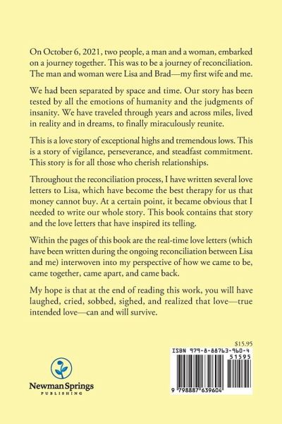 On October 6, 2021, two people, a man and a woman, embarked on a journey together. This was to be a journey of reconciliation. The man and woman were Lisa and Brad--my first wife and me. We had been separated by space and time. Our story has been tested by all the emotions of humanity and the judgments of insanity. We have traveled through years and across miles, lived in reality and in dreams, to finally miraculously reunite. This is a love story of exceptional highs and tremendous lows. This is a story of vigilance, perseverance, and steadfast commitment. This story is for all those who cherish relationships. Throughout the reconciliation process, I have written several love letters to Lisa, which have become the best therapy for us that money cannot buy. At a certain point, it became obvious that I needed to write our whole story. This book contains that story and the love letters that have inspired its telling. Within the pages of this book are the real-time love letters (which have been written during the ongoing reconciliation between Lisa and me) interwoven into my perspective of how we came to be, came together, came apart, and came back. My hope is that at the end of reading this work, you will have laughed, cried, sobbed, sighed, and realized that love--true intended love--can and will survive.
