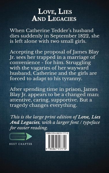When Catherine Tedder's husband dies suddenly in September 1822, she is left alone with two small girls. Accepting the proposal of James Blay Jr. sees her trapped in a marriage of convenience - for him. Struggling with the vagaries of her wayward husband, Catherine and the girls are forced to adapt to his tyranny. After spending time in prison, James Blay Jr. appears to be a changed man: attentive, caring, supportive. But a tragedy changes everything. This is the large print edition of Love, Lies And Legacies, with a larger font / typeface for easier reading.¿