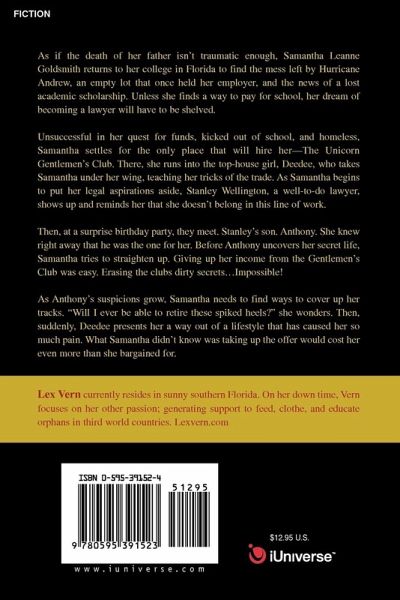 As if the death of her father isn't traumatic enough, Samantha Leanne Goldsmith returns to her college in Florida to find the mess left by Hurricane Andrew, an empty lot that once held her employer, and the news of a lost academic scholarship. Unless she finds a way to pay for school, her dream of becoming a lawyer will have to be shelved. Unsuccessful in her quest for funds, kicked out of school, and homeless, Samantha settles for the only place that will hire her-The Unicorn Gentlemen's Club. There, she runs into the top-house girl, Deedee, who takes Samantha under her wing, teaching her tricks of the trade. As Samantha begins to put her legal aspirations aside, Stanley Wellington, a well-to-do lawyer, shows up and reminds her that she doesn't belong in this line of work. Then, at a surprise birthday party, they meet. Stanley's son. Anthony. She knew right away that he was the one for her. Before Anthony uncovers her secret life, Samantha tries to straighten up. Giving up her income from the Gentlemen's Club was easy. Erasing the clubs dirty secrets.Impossible! As Anthony's suspicions grow, Samantha needs to find ways to cover up her tracks. "Will I ever be able to retire these spiked heels?" she wonders. Then, suddenly, Deedee presents her a way out of a lifestyle that has caused her so much pain. What Samantha didn't know was taking up the offer would cost her even more than she bargained for.