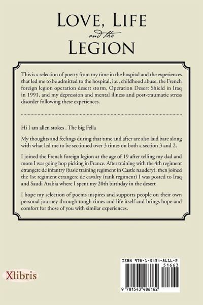 This is a selection of poetry from my time in the hospital and the experiences that led me to be admitted to the hospital, i.e., childhood abuse, the French foreign legion operation desert storm, Operation Desert Shield in Iraq in 1991, and my depression and mental illness and post-traumatic stress disorder following these experiences.