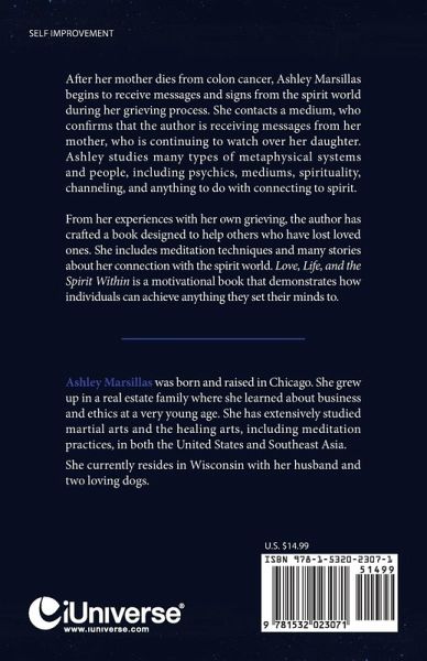 After her mother dies from colon cancer, Ashley Marsillas begins to receive messages and signs from the spirit world during her grieving process. She contacts a medium, who confirms that the author is receiving messages from her mother, who is continuing to watch over her daughter. Ashley studies many types of metaphysical systems and people, including psychics, mediums, spirituality, channeling, and anything to do with connecting to spirit. From her experiences with her own grieving, the author has crafted a book designed to help others who have lost a loved one. She includes meditation techniques and many stories about her connection with the spirit world. Love, Life, and the Spirit Within is a motivational book that demonstrates how an individual can achieve anything they set their mind to.