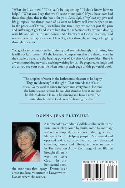 "What do I do now?" "This can't be happening!" "I don't know how to help." "What can I say that won't cause more pain?" If you have ever had those thoughts, this is the book for you. Love, Life, Grief and Joy gives real life glimpses into things none of us want to believe will ever happen to us. In the process of Donna Jean telling this true story, we see not just the pain and suffering of grief and death, but also the reflections of a woman dealing with life and all its ups and downs. She knows that God is in charge and no matter what happens next, He will get her through, smiling or laughing through her tears.Yes, grief can be emotionally draining and overwhelmingly frustrating, but it will not last forever. All the love and compassion that are shared, even in the smallest ways, are the healing power of joy that God provides. There is always something new and exciting waiting for us. Be prepared to laugh and cry as you see your own life when you flip each page of this powerful book. "The droplets of water in the bathroom sink seem to be happy. They are "dancing" in the light. That reminds me of our clock. Garry used to dance to the chimes every hour. He took the batteries out because he couldn't stand to hear it and not be able to dance. He must be dancing in Heaven now. The water droplets were God's way of showing me that."