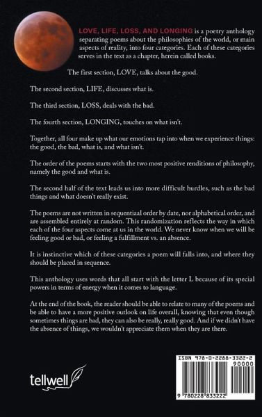 LOVE, LIFE, LOSS, AND LONGING is a poetry anthology separating poems about the philosophies of the world, or main aspects of reality, into four categories. Each of these categories serves in the text as a chapter, herein called books. The first section, LOVE, talks about the good. The second section, LIFE, discusses what is. The third section, LOSS, deals with the bad. The fourth section, LONGING, touches on what isn't. Together, all four make up what our emotions tap into when we experience things: the good, the bad, what is, and what isn't. The order of the poems starts with the two most positive renditions of philosophy, namely the good and what is. The second half of the text leads us into more difficult hurdles, such as the bad things and what doesn't really exist. The poems are not written in sequential order by date, nor alphabetical order, and are assembled entirely at random. This randomization reflects the way in which each of the four aspects come at us in the world. We never know when we will be feeling good or bad, or feeling a fulfillment vs. an absence. It is instinctive which of these categories a poem will falls into, and where they should be placed in sequence. This anthology uses words that all start with the letter L because of its special powers in terms of energy when it comes to language. At the end of the book, the reader should be able to relate to many of the poems and be able to have a more positive outlook on life overall, knowing that even though sometimes things are bad, they can also be really, really good. And if we didn't have the absence of things, we wouldn't appreciate them when they are there.
