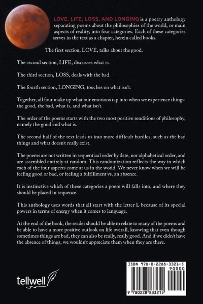 LOVE, LIFE, LOSS, AND LONGING is a poetry anthology separating poems about the philosophies of the world, or main aspects of reality, into four categories. Each of these categories serves in the text as a chapter, herein called books. The first section, LOVE, talks about the good. The second section, LIFE, discusses what is. The third section, LOSS, deals with the bad. The fourth section, LONGING, touches on what isn't. Together, all four make up what our emotions tap into when we experience things: the good, the bad, what is, and what isn't. The order of the poems starts with the two most positive renditions of philosophy, namely the good and what is. The second half of the text leads us into more difficult hurdles, such as the bad things and what doesn't really exist. The poems are not written in sequential order by date, nor alphabetical order, and are assembled entirely at random. This randomization reflects the way in which each of the four aspects come at us in the world. We never know when we will be feeling good or bad, or feeling a fulfillment vs. an absence. It is instinctive which of these categories a poem will falls into, and where they should be placed in sequence. This anthology uses words that all start with the letter L because of its special powers in terms of energy when it comes to language. At the end of the book, the reader should be able to relate to many of the poems and be able to have a more positive outlook on life overall, knowing that even though sometimes things are bad, they can also be really, really good. And if we didn't have the absence of things, we wouldn't appreciate them when they are there.