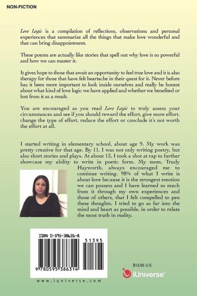 Love Logic is a compilation of reflections, observations and personal experiences that summarize all the things that make love wonderful and that can bring disappointment. These poems are actually like stories that spell out why love is so powerful and how we can master it. It gives hope to those that await an opportunity to feel true love and it is also therapy for those that have felt heartache in their quest for it. Never before has it been more important to look inside ourselves and really be honest about what kind of love logic we have applied and whether we benefited or lost from it as a result. You are encouraged as you read Love Logic to truly assess your circumstances and see if you should reward the effort, give more effort, change the type of effort, reduce the effort or conclude it's not worth the effort at all.