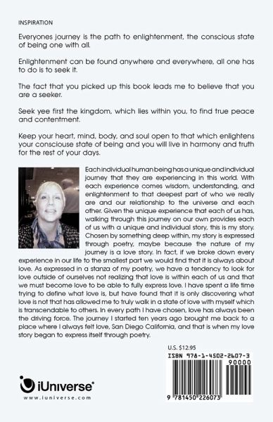 Everyones journey is the path to enlightenment, the conscious state of being one with all. Enlightenment can be found anywhere and everywhere, all one has to do is to seek it. The fact that you picked up this book leads me to believe that you are a seeker. Seek yee first the kingdom, which lies within you, to find true peace and contentment. Keep your heart, mind, body, and soul open to that which enlightens your consciouse state of being and you will live in harmony and truth for the rest of your days.