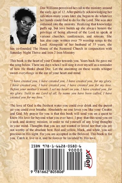 This book is the heart of your Creator towards you. Years back He gave me the song below. There are days when I will sing it over myself as a reminder of how He thinks about Dee. Let the anointing on these words whisper sweet everythings in the ear of your heart and mind. "I have created you, I have created you, I have created you, for my glory. I have created you; I have created you; I have created you for my love. Before your mother's womb, I set my heart on you, I have created you, for my glory. Yield to me Lord of all, by name you have been called, I have created you for my love." The love of God is the freshest water you could ever drink and the purest air you could ever breathe. Absolutely no one loves you like your Creator and God. My prayer for you is that this book will send you on a quest to know His love far beyond what you ever have. I pray that this send you on a seek and destroy mission, in order to rid yourself of any lying thoughts in your mind. Thoughts that you are not wanted or loved nor that you are not worthy of the absolute best. Red and yellow, black, and white, you are precious in His sight. For you are accepted in the Beloved. This book is for you. Catch it, live in it, and be forever be lavished by His love. Dee Williams perceived her call to the ministry around the early age of 12. After publicly acknowledging her salvation many years later she began to do whatever her hands could find to do for the Lord. She was ater ordained into the ministry. Realizing that knowledge puffs up, but love builds up she always honors the privilege of being allowed of the Lord to speak at various churches, conferences, and retreats. She has also copy written over 79 worship songs to the Lord. Alongside of her husband of 35 years, she has co-founded The House of the Restored Church in conjunction with Saturday Night Thrive and Iron 2 Iron Ministry
