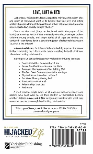Lust or love, which is it? Sitcoms, pop stars, movies, online porn sites and much of Hollywood want us to believe that true love and lasting relationships are a thing of the past found only in old movies and romance novels. Has today's society bought "the lie?" Check out the stats! (They can be found within the pages of this book.) It's alarming. Personal lives are deeply wounded, marriages broken, children, young people, and single adults of all ages are reeling and confused - wandering down a bewildering path of relational destruction. So, what is the answer? In Love, Lust & Lies, Dr. J. Bruce masterfully exposes the sexual lie that is debasing our culture, while boldly revealing the truths that form vibrant and lasting relationships. A must read for single adults of all ages, as well as teenagers and parents who don't want to see their children or themselves become another statistic, Love, Lust & Lies intriguingly wrestles with what truly makes for deeper, meaningful and lasting relationships. This copy of Love, Lust & Lies includes a STUDY GUIDE for personal and group use.