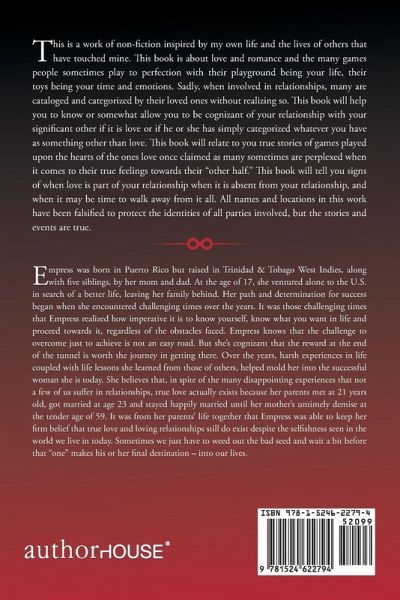 This is a work of non-fiction inspired by my own life and the lives of others that have touched mine. This book is about love and romance and the many games people sometimes play to perfection with their playground being your life, their toys being your time and emotions. Sadly, when involved in relationships, many are cataloged and categorized by their loved ones without realizing so. This book will help you to know or somewhat allow you to be cognizant of your relationship with your significant other if it is love or if he or she has simply categorized whatever you have as something other than love. This book will relate to you true stories of games played upon the hearts of the ones love once claimed as many sometimes are perplexed when it comes to their true feelings towards their "other half." This book will tell you signs of when love is part of your relationship when it is absent from your relationship, and when it may be time to walk away from it all. All names and locations in this work have been falsified to protect the identities of all parties involved, but the stories and events are true.