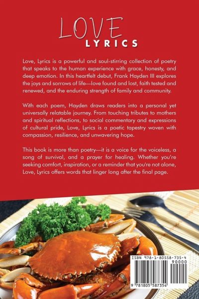 Poetry That Heals, Inspires, and Uplifts the Soul In Love, Lyrics, poet Frank Hayden III delivers a powerful and heartfelt collection of poems that speak to the core of human experience-love, faith, identity, and resilience. From the comforting embrace of a mother's wisdom to the cries of a nation seeking peace, each poem captures the essence of emotion through soulful, lyrical storytelling. With titles like "Victory Is Mine," "Africa," "Feed The Children," and "Keep Your Head Up," this poetic journey explores the beauty and struggle of Black identity, spirituality, personal growth, and community healing. Each verse is a testament to overcoming adversity and finding hope in the smallest of miracles. Whether you're seeking encouragement, celebrating Black heritage, or simply in need of lyrical nourishment, Love, Lyrics offers timeless reflections and relatable truths for readers of all walks of life.