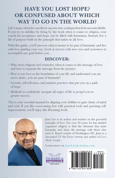 Have you lost hope? Or confused about which way to go in the world? Learn to live through love. Life's many obstacles can throw anyone into a tailspin that feels uncontrollable. Ultimately, everyone is searching for acceptance and joy. If you search for that acceptance and joy by living by the book when it comes to religion, your search for hope can be filled with frustration. Instead, live a life of purpose built on the principles that unite us all: love. Conquering an undiagnosed disability, Armed Forces veteran Juan Lee studied religion for over 30 years. The truth he uncovered: Everyone is ultimately searching for acceptance and joy. Love Made Simple: A Guide to Inner Peace, Contentment, and Success is an earnest look into what it means to be part of humanity and live with love guiding your way. Look at success with new eyes and awareness to accomplish any goal before you. In Love Made Simple, you'll discover:Why most religions feel restrictive when it comes to the message of love and how to separate the message from the practice. How to use love as the foundation of your life and understand you are never alone...you are part of humanity! Growth, self-reflection, and mindset practices that put you on a path of hope. Methods to confidently navigate all stages of life to propel you to greater success. Love Made Simple: A Guide to Inner Peace, Contentment, and Success is your essential manual for aligning your abilities to gain clarity of mind and soul. If you like overcoming fear with practical tools and pursuing self-improvement, then you'll adore Juan Lee's liberating book. Buy Love Made Simple to learn how the simple message of love can guide you today!