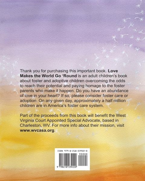 Thank you for purchasing this important book. Love Makes the World Go 'Round is an adult children's book about foster and adoptive children overcoming the odds to reach their potential and paying homage to the foster parents who make it happen. Do you have an abundance of love in your heart? If so, please consider foster care or adoption. On any given day, approximately a half million children are in America's foster care system.