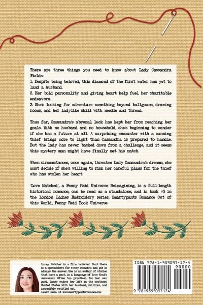 There are three things you need to know about Lady Cassandra Fields: 1. Despite being beloved, this diamond of the first water has yet to land a husband. 2. Her bold personality and giving heart help fuel her charitable endeavors. 3. She's looking for adventure--something beyond ballgowns, drawing rooms, and her ladylike skill with needle and thread. Thus far, Cassandra's abysmal luck has kept her from reaching her goals. With no husband and no household, she's beginning to wonder if she has a future at all. A surprising encounter with a cunning thief brings more to light than Cassandra is prepared to handle. But the lady has never backed down from a challenge, and it seems this mystery man might have finally met his match. When circumstances, once again, threaten Lady Cassandra's dreams, she must decide if she's willing to risk her careful plans for the thief who has stolen her heart. 'Love Matched', a Penny Reid Universe Reimagining, is a full-length historical romance, can be read as a standalone, and is book #3 in the London Ladies Embroidery series, Smartypants Romance Out of this World, Penny Reid Book Universe.