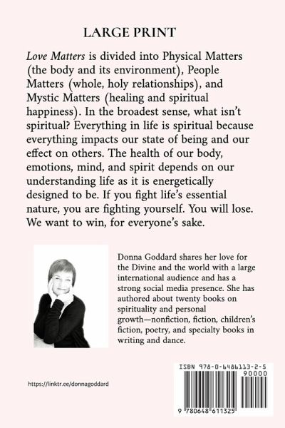 LARGE PRINT Love Matters is a thoughtful and tender companion for living with more balance, depth, and quiet joy. In this second book of the Sweet Spirit Series, Donna Goddard explores the presence of love in all aspects of our human experience. With clear insight and spiritual warmth, she guides us through three essential gateways of inner and outer life: Physical Matters - honouring the body and the spaces we inhabit People Matters - nurturing relationships that are honest, kind, and soul-reflective Mystic Matters - opening to stillness, guidance, and the unseen currents of grace While Touched by Love invites us into self-awareness and spiritual connection, Love Matters continues the conversation-offering a grounded vision of how love can shape our choices, our energy, and our everyday lives.