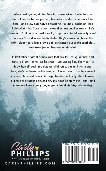 When hostage negotiator Rafe Mancuso takes a bullet to save Sara Rios, his former partner, his actions make him a bona fide hero — and New York City's newest most eligible bachelor. Then Rafe admits that Sara is much more than just another woman he's rescued. Suddenly, a firestorm of gossip turns him into exactly what he doesn't want to be: the Bachelor Blog's newest hot topic. His only solution is to leave town and get himself out of the spotlight… and sexy, jaded Sara out of his mind. NYPD officer Sara Rios has Rafe to thank for saving her life, and Rafe to blame for the media chaos surrounding her. She wants to throw herself back into duty at full throttle, but until her injuries heal, she's on leave and in search of her rescuer. From the moment she finds Rafe and meets his large, boisterous family, she's hooked. But mutual attraction doesn't always mean happily-ever-after, and these two have a long way to go to find their fairy-tale ending.