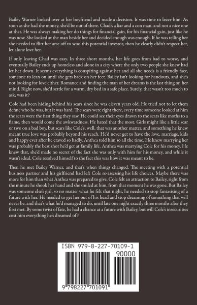 Bailey Warner looked over at her boyfriend and made a decision. She's leaving him. As soon as she has the money, she's out of there. Chad's a liar and a con man, and not a nice one at that. He was always making her do things for financial gain, for his financial gain, just like he was now. She looked at the man beside her and decided enough was enough. If he was telling her she needed to flirt her arse off to woo this potential investor, then he clearly didn't respect her, let alone love her. If only leaving Chad was easy. In three short months, her life goes from bad to worse, and eventually Bailey ends up homeless and alone in a city where the only two people she knew let her down. It seems everything is conspiring against her when all she needs is a friendly face, someone to lean on until she gets back on her feet. Bailey isn't looking for handouts, and she's not looking for love either. Romance and finding the man of her dreams is the last thing on her mind. Right now, she'd settle for a warm, dry bed in a safe place. Surely, that wasn't too much to ask, was it? Cole had been hiding behind his scars since he was eleven years old. He tried not to let them define who he was, but it was hard. The scars were right there, every time someone looked at him they were the first things they saw. He could see their eyes drawn to the scars like moths to a flame, then would come the awkwardness. He hated that the most. Girls might like a little scar or two on a bad boy, but scars like Cole's, well, that was another matter, and something he knew meant true love was probably beyond his reach. He'd never get to have the love, marriage, kids and happy ever after he craved so badly. Anthea told him that all the time. He knew marrying her was probably the best shot he'd get at family life. Anthea was marrying Cole for his money. He knew that. She'd made no secret of the fact she was only with him for his money, and while it wasn't ideal, Cole resolved himself to the fact this was how it was meant to be. Then he met Bailey Warner, and things changed. The meeting with a potential business partner and his girlfriend had left Cole re-assessing his life choices. Maybe there was more for him than what Anthea was prepared to give. Cole felt an attraction to Bailey, right from the minute he shook her hand and she smiled at him, from that moment he was gone. But Bailey was someone else's girl, so no matter what he felt that night, he needed to stop fantasising of a future with her. He needed to get her out of his head and stop dreaming of something that would never be, and that's what he'd managed to do, until late one night exactly three months after they first met. By some twist of fate, he had a chance at a future with Bailey, but will Cole's insecurities cost him everything he's dreamed of?