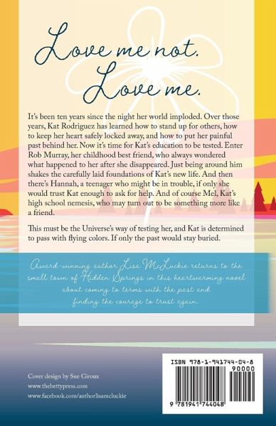 It's been ten years since the night her world imploded. Over those years, Kat Rodriguez has learned how to stand up for others, how to keep her heart safely locked away, and how to put her painful past behind her. Now it's time for Kat's education to be tested. Enter Rob Murray, her childhood best friend, who always wondered what happened to her after she disappeared. Just being around him shakes the carefully laid foundations of Kat's new life. And then there's Hannah, a teenager who might be in trouble, if only she would trust Kat enough to ask for help. And of course Mel, Kat's high school nemesis, who may turn out to be something more like a friend. This must be the Universe's way of testing her, and Kat is determined to pass with flying colors. If only the past would stay buried. Award-winning author Lisa McLuckie returns to the small town of Hidden Springs in this heartwarming novel about coming to terms with the past and finding the courage to trust again.