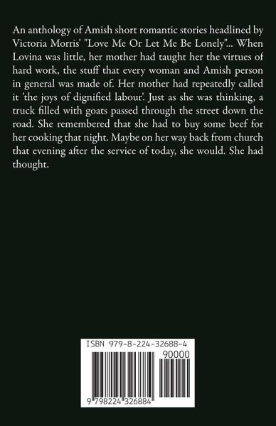 An anthology of Amish short romantic stories headlined by Victoria Morris' "Love Me Or Let Me Be Lonely"... When Lovina was little, her mother had taught her the virtues of hard work, the stuff that every woman and Amish person in general was made of. Her mother had repeatedly called it 'the joys of dignified labour'. Just as she was thinking, a truck filled with goats passed through the street down the road. She remembered that she had to buy some beef for her cooking that night. Maybe on her way back from church that evening after the service of today, she would. She had thought.