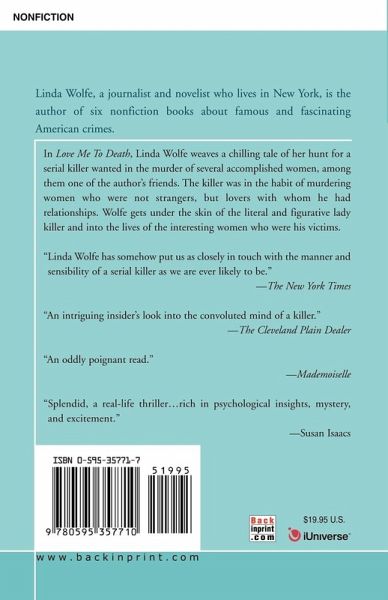 In Love Me To Death, Linda Wolfe weaves a chilling tale of her hunt for a serial killer wanted in the murder of several accomplished women, among them one of the author's friends. The killer was in the habit of murdering women who were not strangers, but lovers with whom he had relationships. Wolfe gets under the skin of the literal and figurative lady killer and into the lives of the interesting women who were his victims. 'Linda Wolfe has somehow put us as closely in touch with the manner and sensibility of a serial killer as we are ever likely to be." -The New York Times 'An intriguing insider's look into the convoluted mind of a killer." -The Cleveland Plain Dealer 'An oddly poignant read." -Mademoiselle 'Splendid, a real-life thriller.rich in psychological insights, mystery, and excitement." -Susan Isaacs