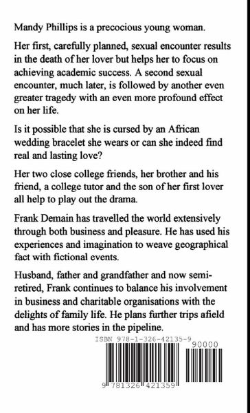 Recently-widowed Richard Hamilton makes love to Mandy Phillips not realising that she is virtually the same age as his son - not yet sixteen. This horrifies him and he commits suicide. His death transforms Mandy from rebellious teenager into a focussed and hard-working young student. On the day of her graduation she consummates a longstanding friendship with fellow student, David Watkins. David and her parents are killed in a horrific accident and she gives up a promising career to look after her younger brother. That leads to further experiences, including one with Richard's son, that have deeply distressing outcomes. Out-of-the-blue, Mandy receives an invitation to join her former tutor at a lecture he is giving at Nottingham University. He confesses that his invitation is a cover for a much deeper purpose and he proposes marriage. At last happiness seems to beckon but might her relationships be cursed by an African wedding bracelet she has worn since the day before she met Richard?
