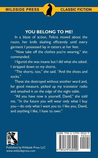 YOU BELONG TO ME! In a blaze of action, Felicia moved about the room, her knife slashing efficiently until every garment I possessed lay in tatters at her feet. "Now take off the clothes you're wearing," she commanded. I figured she was insane but I did what she asked. I stripped down to my shorts. "The shorts, too," she said. "And the shoes and socks." These she destroyed without another word and, for good measure, picked up my transistor radio and smashed it on the edge of the night table. "All you have now is yourself, David," she told me. "In the future you will wear only what I buy you -- do only what I want you to. I like you, David, and anything I like, I have to own."