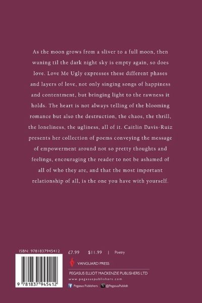 As the moon grows from a sliver to a full moon, then waning til the dark night sky is empty again, so ¿does love. Love Me Ugly expresses these different phases and layers of love, not only singing songs ¿of happiness and contentment, but bringing light to the rawness it holds.¿ The heart is not always telling of the blooming romance but also the destruction, the chaos, the ¿thrill, the loneliness, the ugliness, all of it. Caitlin Davis-Ruiz presents her collection of poems ¿conveying the message of empowerment around not so pretty thoughts and feelings, encouraging ¿the reader to not be ashamed of all of who they are, and that the most important relationship of all, ¿is the one you have with yourself.¿