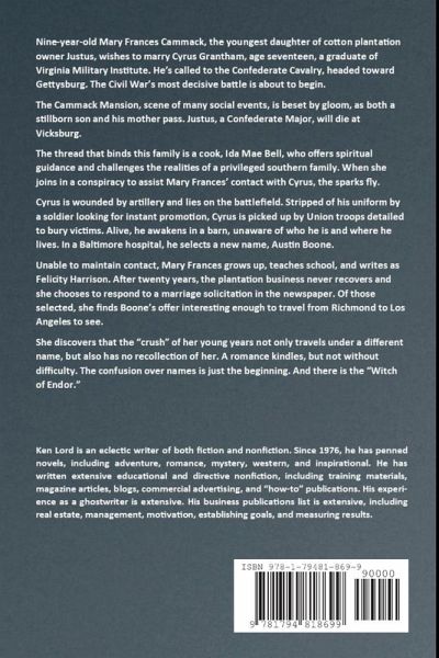 Mary Frances Cammack, 9, wishes to marry Cyrus Grantham, 17, a graduate of Virginia Military Institute. He's in the Confederate Cavalry, headed toward Gettysburg. The Cammack Mansion is beset by gloom, due to the death of the mother and a sibling. The father will die at Vicksburg. The thread that binds this family is a cook, Ida Mae Bell, who joins in a conspiracy to assist Mary Frances' contact with Cyrus. Cyrus is wounded by artillery and is stripped of his uniform. He is picked up by Union troops detailed to bury victims. When he awakens in a barn, unaware of who he is, he selects a new name, Austin Boone. Mary Frances grows, teaches, and writes as Felicity Harrison. After 20 years, she responds to a marriage solicitation in the newspaper, taking Boone's offer to travel from Richmond to Los Angeles. Austin has no recollection of her. A romance kindles, but not without difficulty. The confusion over names is just the beginning. And there is the "Witch of Endor."