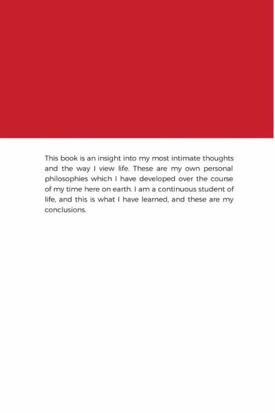 This book is an insight into my most intimate thoughts and the way I view life. These are my own personal philosophies which I have developed over the course of my time here on earth. I am a continuous student of life, and this is what I have learned, and these are my conclusions.