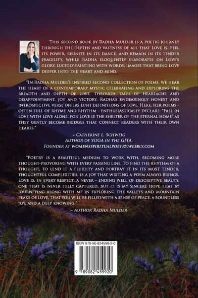 Take a heart-filling journey thru the breadth and depths of Radha Mulder's poetry in this second book, a large Collection of 60 Poems set against 60 visually stunning Photographs. A moving book filled with stirring poetry written on the topic of Love, in all its glory, in every hue, with all its passion and emotions that it evokes. Love is not merely a concoction of emotions, moved by passion, and stirred by sentiment, it is a deep knowing, an abiding faith, a comfort and a place one can call home. Radha dives deep to explore this topic which creates the very bonds of life that every heart seeks, and brings it to it's essence in this compilation of 60 poems, sure to engage and enrapture every heart that seeks, wonders, and longs for that true expression called Love.