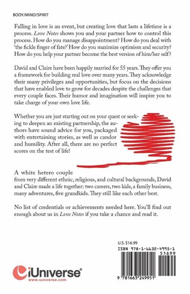 Falling in love is an event, but creating love that lasts a lifetime is a process. Love Notes shows you and your partner how to control this process. How do you manage disappointment? How do you deal with 'the fickle finger of fate?' How do you maximize optimism and security? How do you help your partner become the 'best version of him/her self? David and Claire have been happily married for 55 years. They offer you a framework for building 'real love' over many years. They acknowledge their many privileges and opportunities, but focus on the decisions that have enabled love to grow for decades despite the challenges that every coupe faces. Their humor and imagination will inspire you to take charge of your own love life. Whether you are just starting out on your quest or seeking to deepen an existing partnership, the authors have sound advice for you, packaged with entertaining stories, as well as candor and humility. After all, there are no perfect scores on the test of life!