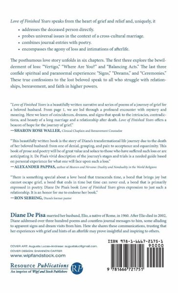 Love of Finished Years speaks from the heart of grief and relief and, uniquely, it -addresses the deceased person directly. -probes universal issues in the context of a cross-cultural marriage. -combines journal entries with poetry. -encompasses the agony of loss and intimations of afterlife. The posthumous love story unfolds in six chapters. The first three explore the bewilderment of loss: ""Vertigo,"" ""Where Are You?"" and ""Balancing Acts."" The last three confide spiritual and paranormal experiences: ""Signs,"" ""Dreams,"" and ""Ceremonies."" These true confessions to the lost beloved speak to all who struggle with relationships, bereavement, and faith in higher powers.