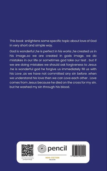 This book enlightens some specific topic about love of God in very short and simple way. God is wonderful ,he is perfect in his works ,he created us in his image..so we are created in gods image. we do mistakes in our life or sometimes god take our test . but if we are doing mistakes we should ask forgiveness to Jesus .he is wonderful god he forgive us immediately fill us with his Love ,as we have not committed any sin before .when we understand his love then we can Love each other . Love comes from Jesus because he died on the cross for my sin. but he washed my sin through his blood