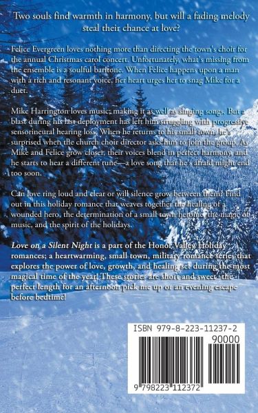 Two souls find warmth in harmony, but will a fading melody steal their chance at love? Felice Evergreen loves nothing more than directing the town's choir for the annual Christmas carol concert. Unfortunately, what's missing from the ensemble is a soulful baritone. When Felice happens upon a man with a rich and resonant voice, her heart urges her to snag Mike for a duet. Mike Harrington loves music; making it as well as singing songs. But a blast during his last deployment has left him struggling with progressive sensorineural hearing loss. When he returns to his small town, he's surprised when the church choir director asks him to join the group. As Mike and Felice grow closer, their voices blend in perfect harmony, and he starts to hear a different tune-a love song that he's afraid might end too soon. Can love ring loud and clear or will silence grow between them? Find out in this holiday romance that weaves together the healing of a wounded hero, the determination of a small town heroine, the magic of music, and the spirit of the holidays. Love on a Silent Night is a part of the Honor Valley Holiday romances; a heartwarming, small town, military romance series that explores the power of love, growth, and healing set during the most magical time of the year! These stories are short and sweet -the perfect length for an afternoon pick me up or an evening escape before bedtime!