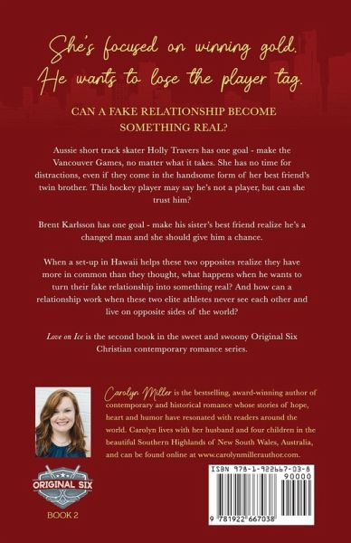 She's focused on winning gold. He wants to lose the player tag. Can a fake relationship become something real? Aussie short track skater Holly Travers has one goal - make the Vancouver Olympic Games, no matter what it takes. She has no time for distractions, even if they come in the handsome form of her Canadian best friend's twin brother. This hockey player may say he's not a player, but can she trust him? Brent Karlsson has one goal - make his sister's best friend realize he's a changed man and she should give him a chance. When a set-up in Hawaii helps these two opposites see they have more in common than they thought, what happens when he wants to turn their fake relationship into something real? And how can a relationship work when these two elite athletes never see each other and live on opposite sides of the world? Love on Ice is the second book in the Original Six hockey romance series, a sweet, slightly sporty, contemporary romance series.